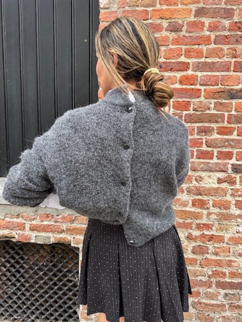Een klassieke look maar met zoveel uitstraling. De trui kan aan twee kanten worden gedragen. De witte bloes eronder maakt de look helemaal af. Zie volgende foto voor meer details.